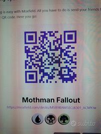 Mazzo di Magic The Gathering formato Commander con comandante The Wise Mothman, direttamente dal set di Fallout. Per consultare la Lista usare il QR code in foto o qua: Main Deck - 81 1 Insidious Fungus 1 Basking Broodscale 1 Cankerbloom 1 Cathedral Acolyte 1 Piper Wright, Publick Reporter 1 Thrummingbird 1 Vexing Radgull 1 Winding Constrictor 1 Eternal Witness 1 Evolution Sage 1 Evolution Witness 1 Feral Ghoul 1 Glowing One 1 Harold and Bob, First Numens 1 Honest Rutstein 1 Infesting Radroach 1 Raul, Trouble Shooter 1 Tato Farmer 1 Tireless Tracker 1 Watchful Radstag 1 Bloatfly Swarm 1 Corpsejack Menace 1 Fathom Mage 1 Lily Bowen, Raging Grandma 1 Nightkin Ambusher 1 The Master, Transcendent 1 The Wise Mothman 1 Young Deathclaws 1 Consuming Aberration 1 Marcus, Mutant Mayor 1 Mirelurk Queen 1 Syr Konrad, the Grim 1 Screeching Scorchbeast 1 Strong, the Brutish Thespian 1 Lumbering Megasloth 1 Vraska, Betrayal's Sting 1 Contaminated Drink 1 Experimental Augury 1 Negate 1 Inspiring Call 1 Putrefy 1 Quandrix Command 1 Thirsting Roots 1 Farseek 1 Rampant Growth 1 Cultivate 1 Maelstrom Pulse 1 Harmonize 1 Tezzeret's Gambit 1 Casualties of War 1 Singularity Rupture 1 Find // Finality 1 Everflowing Chalice 1 Sol Ring 1 Contagion Clasp 1 Nuka-Nuke Launcher 1 Talisman of Curiosity 1 Talisman of Resilience 1 Simic Ascendancy 1 Fraying Sanity 1 Garruk's Uprising 1 Vault 87: Forced Evolution 1 Vault 12: The Necropolis 1 Command Tower 1 Exotic Orchard 7 Forest 1 Hinterland Harbor 8 Island 1 Mariposa Military Base 1 Mortuary Mire 1 Nesting Grounds 1 Opulent Palace 1 Overflowing Basin 1 Path of Ancestry 1 Sunken Hollow 7 Swamp 1 Tainted Wood 1 Temple of Malady 1 Temple of Mystery 1 Viridescent Bog 1 Woodland Cemetery Sleeves inviate non saranno quelle in foto