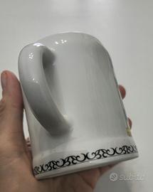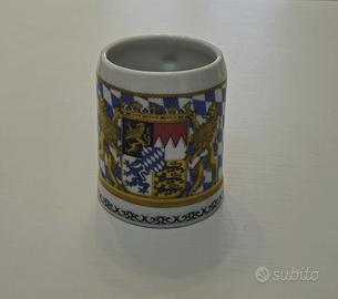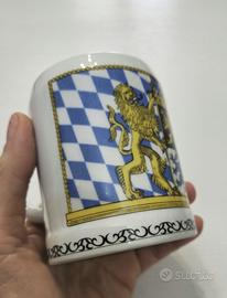 Vendo mug (piccolo boccale da birra - o altro -) in porcellana bavarese Kuhr Sandizell vintage. Altezza 9 cm. Diametro superiore 7 cm. Diametro inferiore 7 cm e mezzo. Bordo superiore leggermente rientrante tipico dei piccoli boccali da birra bavaresi. Kuhr era un noto produttore tedesco di porcellane e boccali di birra con sede a Sandizell, frazione di Schrobenhausen in Baviera. Azienda famosa tra i collezionisti per i boccali in porcellana decorati con motivi bavaresi. Condizioni come da foto Sopra c'è lo stemma ufficiale bavarese sorretto da due leoni dorati su sfondo a rombi bianchi e azzurri, i colori della bandiera bavarese.