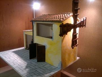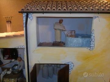 Mulino a vento con forno, completo di statue animate (dimensione 12 cm), artigianale e unico esemplare, curato in ogni dettaglio. Il tutto realizzato con statue in resina e materiali vari. Il gruppo consiste in un edificio con tre ambienti: il forno, il deposito farina, e il mulino vero e proprio.