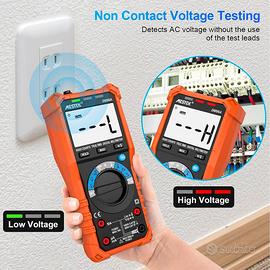 【Alta precisione e versatilità】 6000 conteggi, multimetro digitale Auto-range in grado di misurare: 600mV-1000V AC/DC tensione, 6000uA ~ 10A AC/DC corrente, RMS vero, test di temperatura, resistenza, capacità, frequenza, diodo, test di continuità, test della batteria, identificazione del cavo vivo, test NCV, protezione da sovraccarico di processo a gamma completa. Può essere utilizzato come voltmetro di alta precisione, amperometro, ohmmetro e tester della batteria dell'automobile.