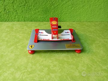 Modello musetto Ferrari F1 2000 n.3 Michael Schumacher. Produzione artigianale, non di serie né in commercio, composto da musetto in plastica e base in alluminio satinato. Targhetta in ottone fatta stampare appositamente per il modello. Adesivo con logo Ferrari. Piedini in legno colorato. Misure 22 cm larghezza , 15 cm profondità, 9.5 cm altezza. A disposizione per eventuali info.