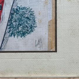 Disegno Vittorio Mussolini - 1971 Firmato. Disegno personale di Vittorio Mussolini (firma VM) figlio di Benito Mussolini su foglio di carta. Rappresenta vista dall'alto di auto in corsa a fianco a due alberi. Anno 1971 come da scritta sulla cornice posteriore. Ottime condizioni normali segni di usura. Misure: 24.5x30cm compresa di cornice. Disegno ufficiale del figlio di Mussolini. Provenienza nota e documentabile.