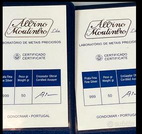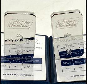 Numero 2 lingotti in argento purissimo 999 da 50 grammi cada uno (totale 100 grammi) con certificato di autenticità. Prezzo non negoziabile prodotto di assoluto valore e di pregevolissima fattura.