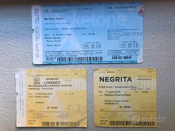 N. 3 biglietti da collezione relativi ai seguenti concerti: 1) Lorenzo Jovanotti - Montichiari (BS) - 13.12.2015 2) Negrita - Casalecchio di Reno (BO) - 11.04.2015 3) Marlene Kuntz - Taneto di Gattatico (RE) - 14.10.2023