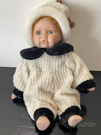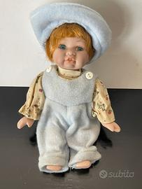Lotto comprendente n. 5 graziosi bambolotti con testa, braccia e gambe in ceramica e corpo imbottito e rivestito in tessuto oltre ad un vestito con cappellino. I bambolotti, dell’altezza di 21 cm. hanno vestiti diversi, anche in più strati, con chiusura in velcro, uno ha una mano mancante.Il peso di un bambolotto è di 180 grammi.Non sono visibili marchi di origine.Risalenti , presumibilmente, agli anni 70.