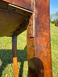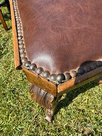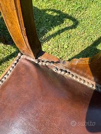 Vendo n. 6 sedie in noce e seduta in similpelle marrone, risalenti alla seconda metà dell’800. Necessitano di piccoli interventi di restauro anche se nel corso degli anni hanno subito dei “recuperi” (più o meno discutibili) tipo: riparazione di gamba rotta, rinforzo della struttura, anti tarlo e stuccatura dei fori da tarlo… Attualmente si trovano in buone condizioni; ho evidenziato in foto alcuni interventi necessari quali: ulteriore antitarlo, sostituzione o aggiunta di profili di borchie, integrazione di un bordo della seduta, pulitura e lucidatura generale. Le sedute sono ancora buone, così come le molle interne. Strutturalmente risultano ancora robuste. Prezzo per tutte e 6 le sedie, nello stato in cui si trovano: 250€. Si trovano a Morsano al Tagliamento (PN). Possibilità di trasporto con furgone, con costo da quantificare in base alla distanza. Post presente in più gruppi.
