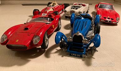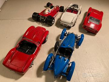 Vendo n. 5 modelli macchine Burago: Ferrari 250 Testarossa scala 1/18, Ferrari GtO 1/18, Lancia Aurelia B24 spider 1/18, Bugatti type 59 1/18, Ferrari 312 T2 scala 1/14. In condizioni come da fotografie. Vendo solo in blocco euro 25.