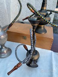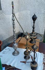 Bellissimi NARGHILE ‘ o PIPE SHISA di origini Persiane e mediorientali, in metallo e ottone , come sopramobili di pregio e originalita’. Di quattro misure in altezza
