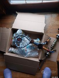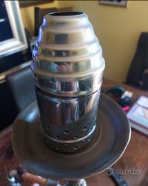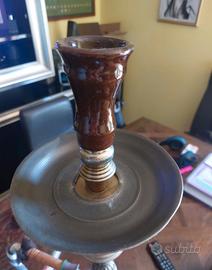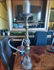 Vendo splendido narghilè (shisha) dallo stile classico e ricercato, perfetto sia per l'utilizzo che come raffinato complemento d'arredo vintage. Il pezzo si distingue per la qualità dei materiali e i dettagli decorativi: • Corpo centrale: Realizzato in ottone massiccio con lavorazione a sbalzo e decorazioni a spirale sulla colonna. • Ampolla: In vetro trasparente con eleganti decorazioni bianche a ghirigori realizzate a mano. • Tubo: Manichetta tradizionale rivestita in tessuto intrecciato bianco e blu, completa di impugnature in legno e finiture morbide. • Accessori inclusi: Dotato di piattello poggia-carboni e coprifuoco (windcover) in metallo traforato, ideale per gestire il calore all'aperto o per sicurezza. Stato dell'oggetto: Il narghilè è in ottime condizioni estetiche, come da foto. La struttura in ottone presenta la tipica patina del tempo che ne attesta l'autenticità (può essere lucidato per riportarlo a specchio o lasciato così per un look più antico). Dettagli Tecnici • Altezza totale: altezza media 80 cm • Materiali: Ottone, Vetro, Legno, Tessuto. • Stile: Orientale / Tradizionale. Già scontato, composto da color argento e blu introvabile per veri amatori dello stile etnico ORIGINALE