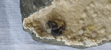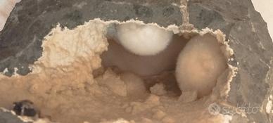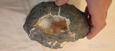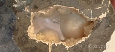 Si tratta di due perfette sfere di cristalli aghiformi di diametro 30 - 40 mm accompagnate da una sfera più piccola e una diffusa cristallizzazione che ricopre interamente la cavità.