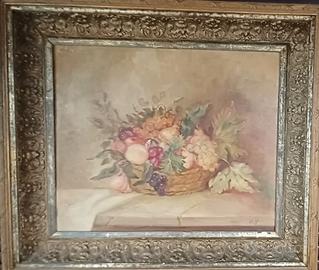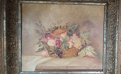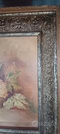 In sintesi, si tratta di una natura morta a olio di gusto classico, probabilmente realizzata tra la fine del XIX e la prima metà del XX secolo, incorniciata da un'importante cornice in legno intagliato e dorato di stile barocco o neobarocco, che si abbina perfettamente al soggetto e allo stile del dipinto.