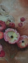 Vecchio quadro di stampo impressionistico, natura morta floreale, che ho fatto recentemente reinquadrare sul retro mentre la MERAVIGLIOSA cornice è quella originale in vero robusto legno magnificamente intarsiato (VEDI FOTO ANNUNCIO). Si trovava nella soffitta di mia nonna. il dipinto raffigura un bouquet di fiori (ranuncoli? anemoni?) dalle tonalità calde (rosa, rosso, arancione e crema). Lo stile è realistico, atmosfera morbida e leggermente sfocata, Ricorda vagamente la pennellata morbida di Renoir probabilmente ripresa dall'artista che ha dipinto questo quadro.