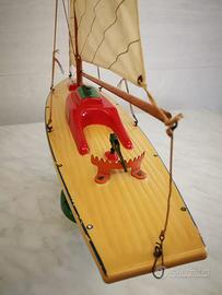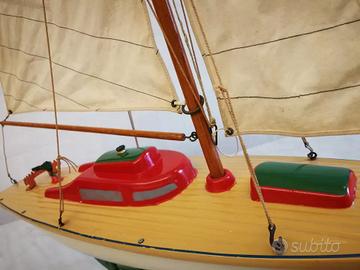 Il giocattolo è giocato ma in ottime condizioni. Non presenta crepe, rotture o mancanza di parti. Acquistato tra il 1970 e 75 nell'allora noto negozio di giocattoli, Silvestrini di Milano. Era uno dei due modelli in vetrina, lo Squalo, modello gemello più grande e il Falco che misura 64 cm di lunghezza x 86cm di altezza, compreso il piedistallo. Il peso del modello è di circa 1,4 kg. Lo scafo è il ponte sono due pezzi sigillati e il materiale è una plastica molto rigida (credo vetroresina o similari) Presenta sul cabinato un buco con tappo presumibilmente atto a riempire lo scafo di acqua per appesantire e bilanciare la deriva. Le vele sono di tessuto pesante con cuciture e 3 bacchette plastiche di rinforzo sulla randa (vela più grande) Le vele possono essere ammainate slegando le corde.