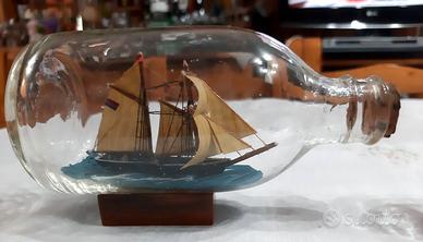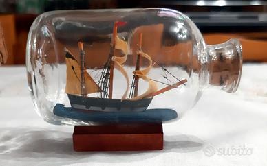 - nelle bottiglie media e piccola le navi sono di legno e le vele penso di tessuto. la nave nella piccola e' staccata ma sta benissimo al suo posto.