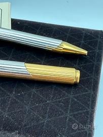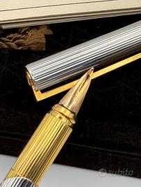 Italia - Seconda metà del 20º secolo - In buone condizioni - usato, con piccoli segni dell'età e macchie. Set Scrittura Nazareno Gabrielli La Penna - Stilografica e Sfera Esclusivo set da scrittura vintage firmato dal celebre designer italiano Nazareno Gabrielli. II set comprende una penna stilografica e una penna a sfera coordinate, caratterizzate da un design elegante e materiali di alta qualità. Caratteristiche principali Produttore: Nazareno Gabrielli Modello: La Penna Produzione:Italia Materiali:Corpo e cappuccio con raffinata lavorazione a righe verticali placcato in oro e platino Dettagli stilografica: Pennino in oro massiccio 14 carati (585) con punta di gradazione media. Caricamento a cartuccia o convertitore (non incluso)