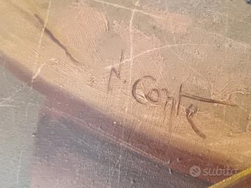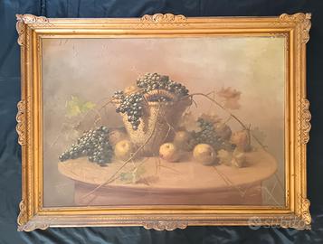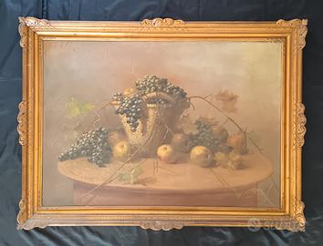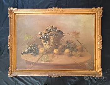 Affascinante e scenografico dipinto originale Nazzareno Conte, capace di catturare immediatamente lo sguardo con una composizione ricca e armoniosa, una cesta traboccante d’uva matura, circondata da mele e foglie autunnali, adagiate su un piano dalle tonalità calde e avvolgenti. L’opera trasmette un’atmosfera intima e senza tempo, dove luce soffusa e colori terrosi creano un effetto pittorico elegante e raffinato, tipico della tradizione figurativa italiana tra Otto e Novecento. Un pezzo di forte presenza decorativa, ideale per impreziosire ambienti classici, studi professionali, salotti o location di charme. Dimensioni con cornice: 86 x 116 cm Dimensioni senza cornice: 100 x 70 cm Il dipinto conserva tutto il fascino del tempo: leggera craquelure diffusa patina superficiale che ne addolcisce i toni piccoli segni coerenti con l’età visibili in foto. La cornice originale, finemente decorata, valorizza ulteriormente l’opera e ne amplifica l’impatto visivo