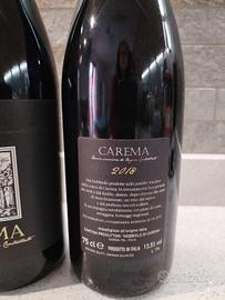 Due bottiglie di vino rosso piemontese Carema DOC 100% Nebbiolo del 2018. Si distingue per colore granato, profumi di fiori secchi, frutti rossi e spezie.