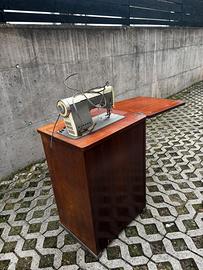 Macchina vintage interamente in metallo, montata su mobile originale in legno con piano richiudibile.
