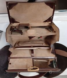 Bel necessaire in pelle da viaggio di produzione portoghese, compato e ben organizzato, questo necessaire era pensato per la donne sofisticate che viaggiavano spesso , vari scomparti destinati a contenere, rossetto, portacipria spazzolino etc, specchio, piccola luce alimentata a pile che serviva per piccoli ritocchi al trucco in condizionidi scarsa illuminazione, rimangono, degli accessori originali, un pettinino e una penna con medaglione con lettera M, condizioni perfette, la spedizionenon è compresa.
