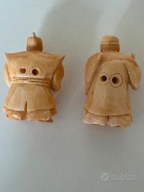 Coppia di bottoni giapponesi. Osso con patinatura lucida.Figure maschili popolari una con spada e l’ altra con rotolo o tavoletta.