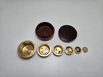 Piccolo nido di pesi di Norimberga con contenitore di legno di palissandro. Unità di misura espressa in once.