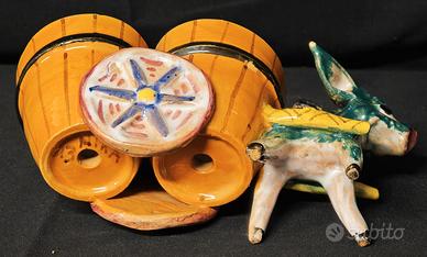 L’opera raffigura un asinello stilizzato, dall’ espressione vivace e dettagli pittorici a mano, che traina due botti decorative, realizzate come piccoli contenitori