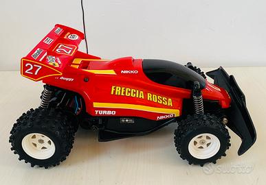 Altra Nikko Freccia Rossa restaurata, con telecomando. Scocca originale con adesivi originali. Alettone in resina verniciato con adesivi repro. Smontata interamente pezzo per pezzo e pulito sia le plastiche interne che l’elettronica e tutte le parti in metallo compresi ammortizzatori e contratti per le batterie. Lucidato la scocca e eliminati i graffi sul vetro nero, sul fondo e sul gear box. Sostituito motore con uno nuovo per riportarla bella grintosa. Cerchioni sbiancati e gomme in ottimo stato. Telecomando originale 2 channel Full Function 27.145 MHz con adesivi in perfetto stato. Disponibili altre foto.