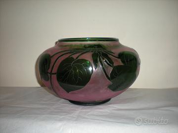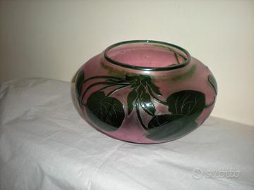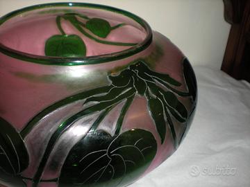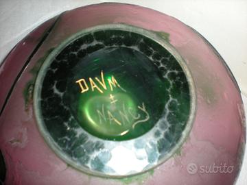Centrotavola firmato Daum Nancy , in pasta di vetro trattata agli ossidi,martellata, decorata a cammeo, e rifinita alla piccola ruota, di gusto Art Nouveau.
