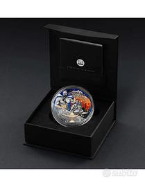 Il rovescio di questa moneta in Argento ritrae Aladdin e Jasmine sul tappeto magico. Volano sotto una luna infuocata che sa di estati roventi e notti speziate. Dietro di loro, il Genio. Maestoso. Affascinante. Lo sguardo giocoso di chi conosce ogni desiderio prima ancora che nasca. Agrabah svanisce nell'ombra. Le sue torri inghiottite dalla notte. Lasciate indietro come una vecchia pelle. Rimane solo il cielo. Il desiderio. Il brivido dell'ignoto. Una scena che profuma di libertà. Il dritto di questa moneta in Argento emana fuoco regale. Ornato ma fiero. Al centro, lo Stemma di Niue si erge con fierezza. Volute barocche si avvolgono attorno all'emblema con forza silente. Tutto intorno, le iscrizioni: "ALADDIN AND THE WONDERFUL LAMP" – il nome della moneta, "2025" – l'anno di conio, "Ag 999" – la finezza dell'Argento, "2 Oz" – il peso della moneta e "5 DOLLARS" – il valore nominale.