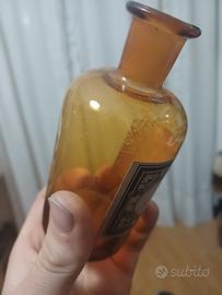 antica bottiglia da farmacia ( vetro con bolle d aria) etichetta con modifiche d eooca vedifoto