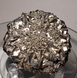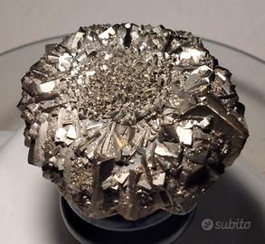 Nodulo di Pirite a forma di sole, uno spettacolo naturale dall’intensa lucentezza metallica. I cristalli radiali creano giochi di riflessi e simmetrie straordinarie, ricordando i raggi del sole in un brillante tramonto dorato.