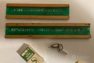 Lotto di un normografo in scatola originale con pennino Plum Pen N° 5 con varie relative penne basiche in legno e due regoli di cui uno da viaggio della Tecnostyl con custodia originale