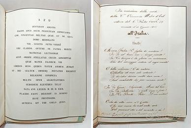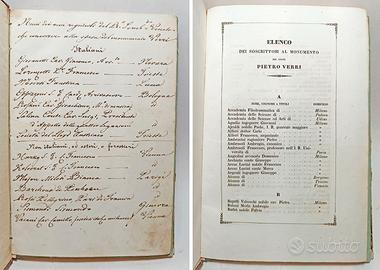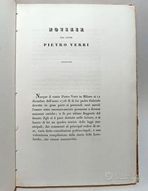 In 8° (22,8x16 cm), pp. 16 (2 di aggiunte e correzioni), 2 tavole fuori testo (protette da velina) incise da Gaetano Bonatti con una medaglia con l'effigie del conte e il monumento scolpito in marmo di Carrara da Innocenzo Fraccaroli (1805-1882) posto nel cortile d'onore del palazzo diBreraa Milano; un foglio ripiegato con “all’Italia” un sonetto manoscritto in occasione della morte della C.ssa Vincenza Melzi d’Eril vedova del C.te Pietro Verri, avvenuta il 18 agosto 1851, un foglio ripiegato con incisioni in latino, un elenco manoscritto dei nomi dei non regionali del Regno Lombardo veneto che concorsero alla spesa del monumento del Verri. Testo incorniciato.