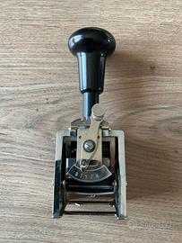 Numeratore automatico d'epoca a 6 cifre in bronzo (3,5 mm), pezzo di modernariato italiano in metallo cromato e bachelite nera. L'oggetto è in ottime condizioni meccaniche ed estetiche, completo della sua scatola originale blu. Un pezzo da collezione ideale per scrivanie di design o amanti della cancelleria storica.