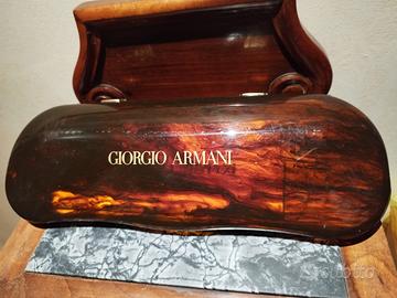 - Astuccio per occhiali Giorgio Armani. Lenti oversize con montatura in bronzo, in astuccio originale con motivo tartarugato, disegnato da Giorgio Armani per celebrare l'ingresso in Luxottica, 1970 circa.