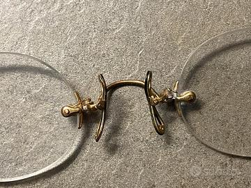 Occhiali/pince-nez vintage con custodia originale, molto diffusi tra fine Ottocento e inizi Novecento, presumibilmente da vista o da lettura, con montatura metallica e lenti ovali. Da COLLEZIONE