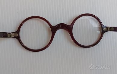 Occhiali vintage, anni '20, in celluloide marcati P. SBISA' (Fabbrica occhialeria P. Sbisà Firenze, articoli di ottica e geodesia, forniture per fotografia) montatura in celluloide brown, misura tra le due aste 125 mm. (small/medium);diametro lenti 39 mm. Buone condizioni, lenti graduate da sostituire.