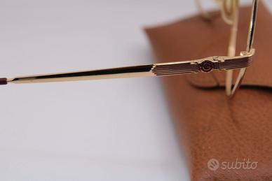 La montatura è realizzata in metallo dorato con linee sottili ma decise, una forma oversize geometrica dal forte richiamo retrò, tipica dell’estetica eyewear di fine Novecento. Il ponte strutturato e i dettagli meccanici sulle cerniere conferiscono solidità visiva e un look sofisticato, mentre i naselli originali ambrati e le aste con terminali scuri completano un insieme raffinato e distintivo.