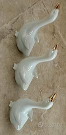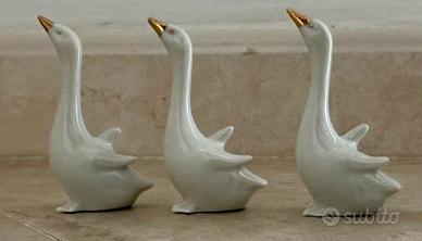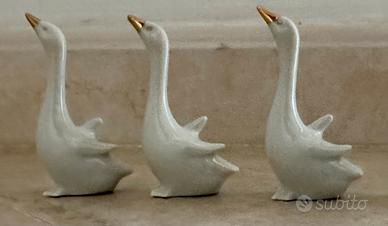 3 oche in porcellana finissima bianca con occhi e becco dorato. Le oche sono nuove si trovano in ottimo stato . Hanno dimensioni altezza 7,5 cm, lunghezza 4 cm e profondità 3 cm. Saranno accuratamente imballate e spedite.