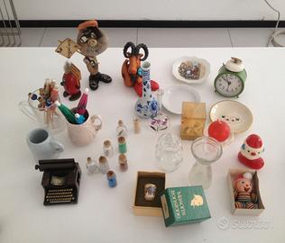 21 pezzi tra cui miniature di: piatti, bottiglie con messaggio, sveglia, macchina da scrivere