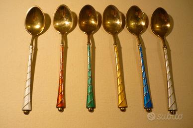 6 foto: Cucchiaini da caffè, argento placcato oro, smalto, Danimarca. 6 pezzi. Francobollo Ela Danimarca sterling 9255. Artigiano Egon Lauridsen. Lunghezza 9,5 cm. Condizioni impeccabili, mai usato. Il prezzo del set è di 250 euro.