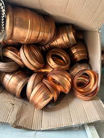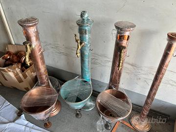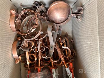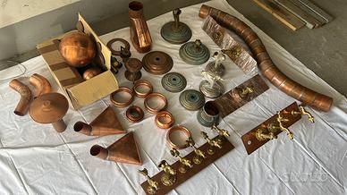 Vendo lotto completo in rame e ottone. Materiale di qualità, con ottima resa estetica sia lucido che ossidato. Elementi in rame •2 tramogge / imbuti quadrati in rame Forma piramidale con uscita cilindrica Ideali per convogliare acqua o come elementi decorativi industriali •1 sfera in rame (parzialmente visibile in scatola) Ottima per decorazioni •1 tubo curvo segmentato in rame Lavorazione artigianale a settori saldati Perfetto come elemento scenografico o canalizzazione •1 tubo cilindrico in rame •Sezione diritta, buono stato •Serie di anelli/ghiere in rame (circa 6 pezzi) Diverse dimensioni, utili per raccordi o decorazioni •1 bobina di filo in rame Ideale per lavorazioni artigianali o elettriche •Vari raccordi e piccoli componenti in rame •2 fontane di design Inclusi pezzi filettati e giunti Elementi in ottone (rubinetteria) •2 pannelli con rubinetti multipli (totale circa 10 rubinetti) Montati su supporto in rame Stile classico, ottimo per fontane o ambienti rustici •3 rubinetti singoli su piastra Design vintage Rosoni / basi decorative (rame ossidato) •6 rosoni circolari con patina verde Effetto anticato naturale molto bello Utilizzabili come basi per rubinetti o decorazioni •3 rosoni in rame lucido Altri componenti •Supporti e basi rettangolari in rame •Piccoli raccordi e accessori in ottone •Materiale: rame pieno + ottone •Stato: usato ma in buone condizioni, con normale ossidazione (facilmente lucidabile) •Ideale per: •Restauro fontane o impianti •Arredamento industrial / vintage •Progetti artistici o fai-da-te •Recupero materiale SI ACCETTANO OFFERTE