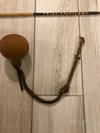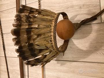 arco e due frecce un copricapo di penne e uno strumento tipo maracas in uso nella tribu degli Xavante nell'amazzonia di piu di sessant'anni fa. oggetti ben conservati