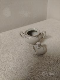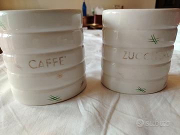 Tre contenitori in ceramica di caffè di sale e di zucchero di cui uno con coperchio in legno e una piccola zuccheriera in porcellana con coperchio il tutto degli anni cinquanta piccoli oggetti da collezione