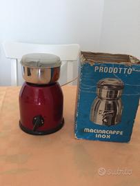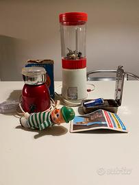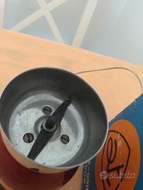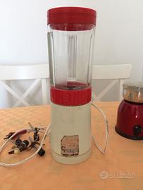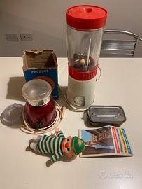 Oggetti vintage da collezione. Frullatore con bicchiere in vetro Bialetti. Macinacaffè in acciaio marca Sprint. Un pupazzo giocattolo antico a carica. Orginale siringa in vetro completa di aghi e sui contenitore per la sterilizzazione. Completa il tutto una vecchia mini guida di Firenze realizzata da Aquila.
