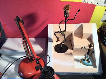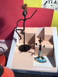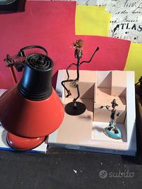 Lotto di oggetti vintage. Una lampada a pantografo, due statuine cm 26 e cm 16. Una in ferro molto ben rifinita, l’altra in ceramica con una piccola mancanza alla base ma comunque molto bella