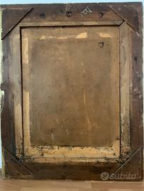 Sul retro si ripete più volte lo stesso timbro sia sulla cornice che sulla tavola. É presente anche anello in ferro per appendere il quadro.