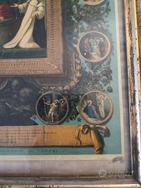 Antica oleografia devozionale fine ‘800 raffigurante la Beata Vergine del Rosario con Bambino e santi domenicani; stampa riportante la benedizione al Sacro Altare di Pompei (collegata al Beato Bartolo Longo e alla contessa Marianna di Fusco). Cornice coeva. Tag # oleografia, Madonna, Rosario, Pompei, Bartolo Longo, arte devozionale, fine ‘800, cornice coeva