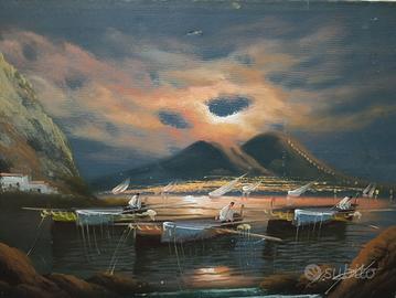 Soggetto: Raffigura una marina con pescatori al lavoro su barche, con il Vesuvio e le luci della costa napoletana sullo sfondo in un'atmosfera notturna o al crepuscolo.