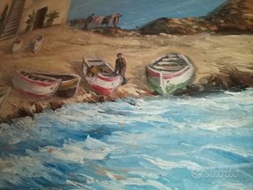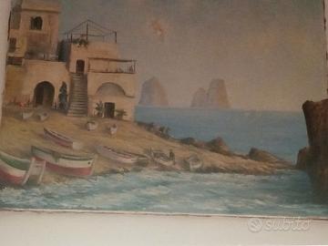 bellissimo olio su teladei primianni 50 della veduta della marina piccola a capri.il dipinto e senza cornice e misura cm.90 x cm.70.ed e firmato in basso a destra.Presenta un piccolissimo segno di restauro nella parte alya al centro della tela.